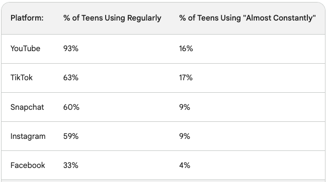 YouTube reigns supreme: 93% of teens use YouTube regularly, with 16% claiming to be "almost constant" users.